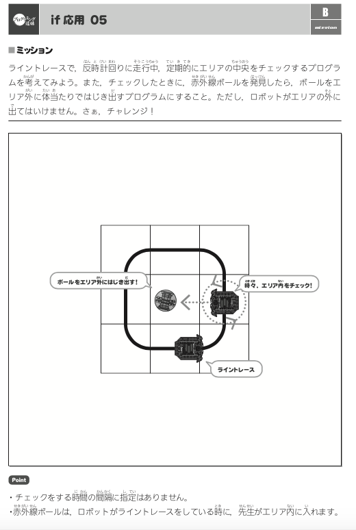 「ループ処理でぐるぐる回しながら」ライントレース処理をしている最中に、自分がよし、ここで動作を切り替えるんだ!!と思ったポイントで、「brake」というコマンドを使い、whileのループ処理を中断、次の工程(ボール蹴飛ばし処理のループ)に移るという論理を組み立てるのがミソです。