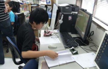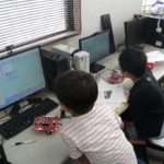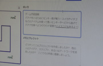 小学校3年のH君の作品です。whileを使った繰り返しで、【前に進んで後ろに戻って90度左回転】を繰り返ることで、このような動きになります。