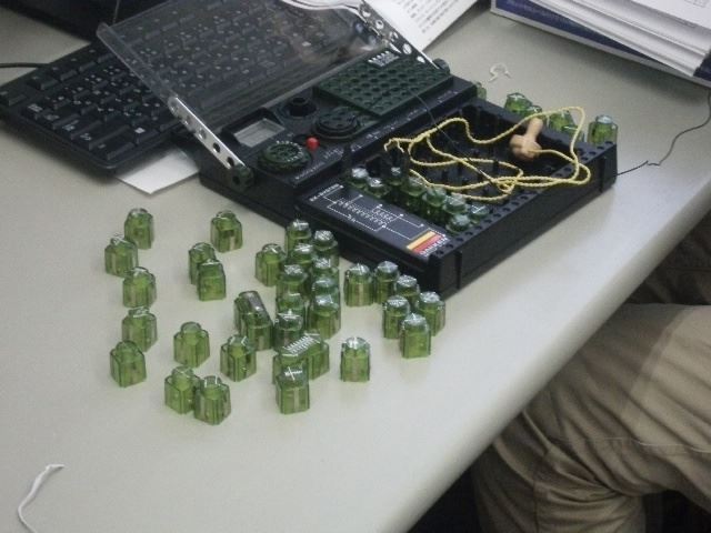緑色ブロックの一個一個の中に、豆電球、抵抗、コンデンサーなどといった電子の部品のどれか一つが入っています。その部品がブロックの外側にあるバネまで電線で繋がっています。どの部品が入っているかは、それぞれのブロックごとに異なります。