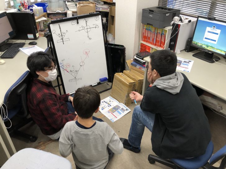 今回の授業では、特に、ボールを当てて跳ね返すためのバーに当たった時のボールの跳ね返り方(難しい言い方をすると、ボールの入射角と反射角に当たる部分)の考え方が難しかったため、先生とみんなで一緒に、ホワイトボードに図を描いて整理しながら作っていきました。