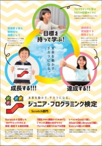 Scratchを使ってゲームを作る中で、創造力、論理的思考能力、問題解決力を育んでいくことは今までと変わりませんが、その成果の見える化としてサーティファイという資格の会社が新たに設けた「ジュニア・プログラミング検定」(https://www.sikaku.gr.jp/js/ks/)という資格試験を随時受験し、それまでに培った能力を確かめながらさらなる段階へとステップアップしていけるようにします。
