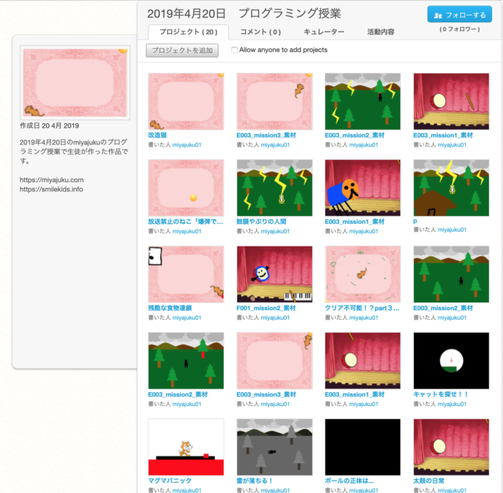 今日、生徒のみんなが作った20個の作品をScratchのサイトにアップしました!