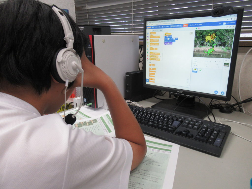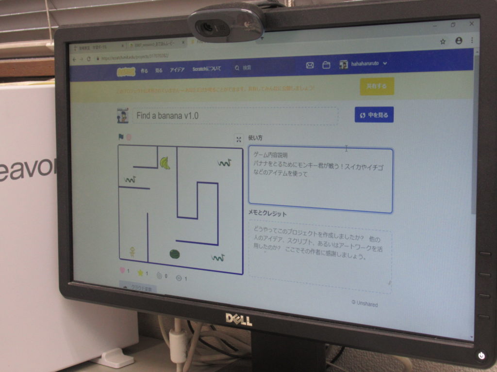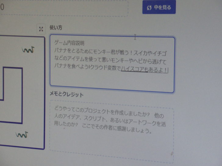 出来上がった作品をScratchのサイトに公開して全世界のみんなが遊べるようにしているのですが、その自分が作った作品の紹介文や、操作方法などの遊び方、パワーアップアイテムの説明など、自分の作った作品について文章にしてまとめる姿も真剣そのものでした。