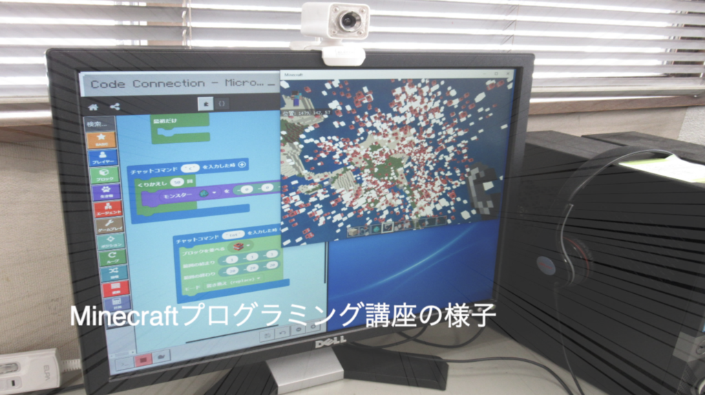 夏休みに行なった、子供たちに人気のゲーム「マインクラフト」の世界のなかを、自分の作ったプログラムで動かすという講座の様子です。