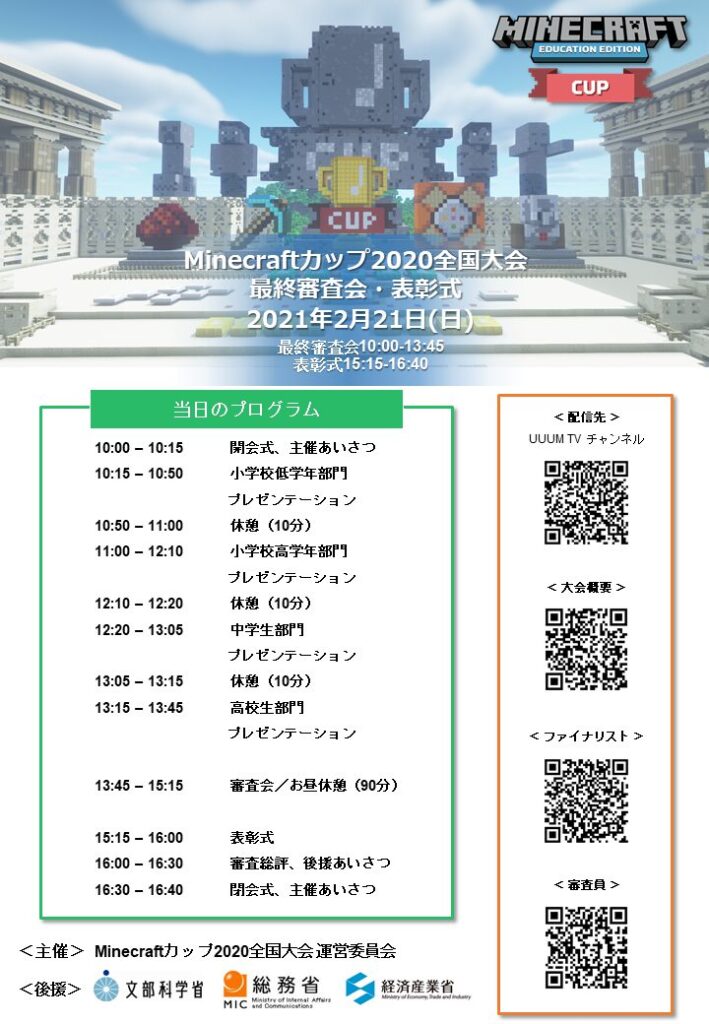朝の10時から、小学生部門の配信が始まるので、ぜひ、「マイクラ極めてるすごい小学生だぁ!」なんて感じで、同世代の発表も見てみてください。午後には、中学生部門が終わった後には、高校生部門もありますよ。