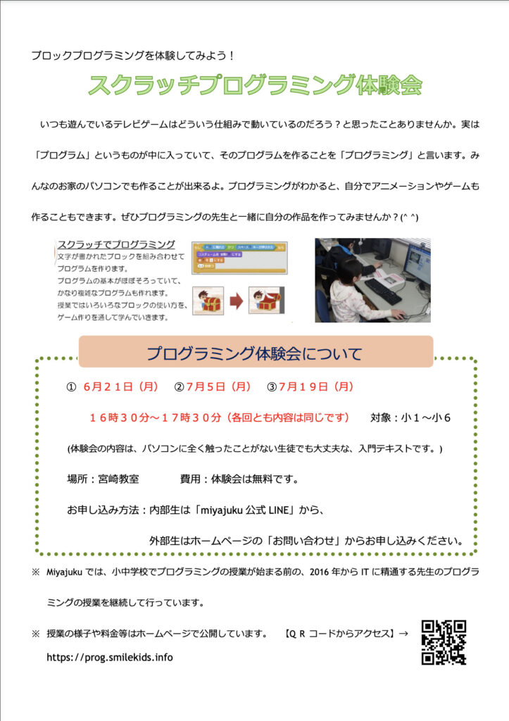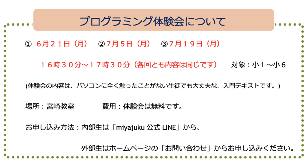 プログラミング教室の体験会をやります! miyajuku 5年前 体験会は無料です。この機会に、ぜひMiyajukuプログラミング教室を体験してみてください。 体験チラシのPDFはこちら → 体験会チラシダウンロード