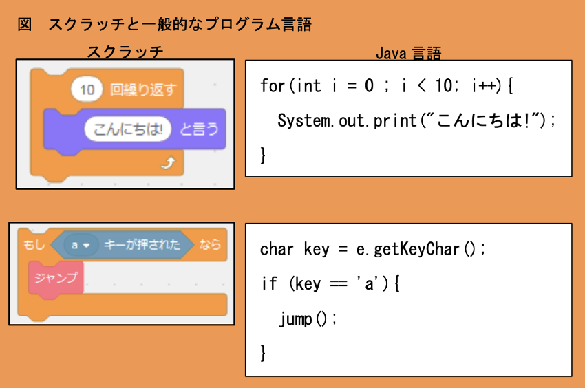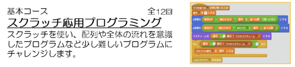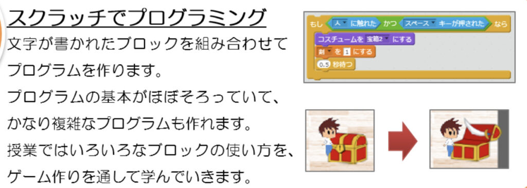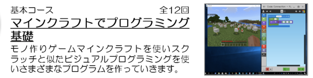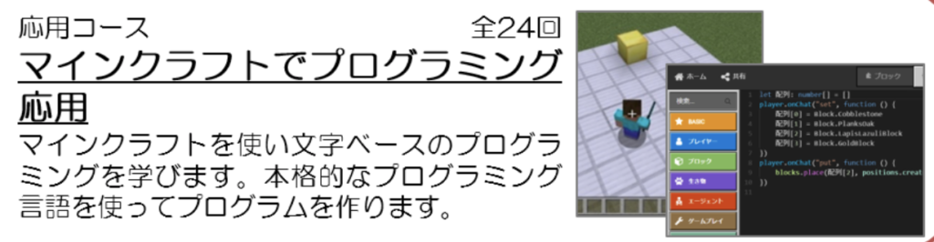 初歩はブロックを並べるだけで簡単にプログラミングを学ぶことができるScratchから始め、最終的にはMinecraftのブロック建築を、javaScriptというプログラミング言語を用いて、キーボードから文字で打ちこんで高速に自動的に建築してくれるプログラムを作り上げるカリキュラムを用意しています。