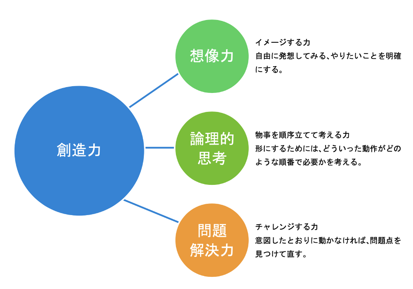 ゲーム作りなどの楽しい題材を元にしながらも、「想像(創造) 〜 思考 〜 問題解決」のサイクルを何度も繰り返して自らの作りたい姿に向けて繰り返し挑戦し、訓練することができることがプログラミング教育の最大のメリットです。