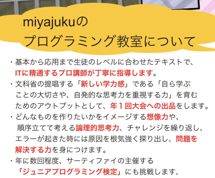 miyajukuのプログラミング教室は、ゲーム作りなどを題材にした興味関心を持ちやすいテキストを用いて、生徒のスキルに合わせ、無理なく学習できるように授業を進めます。授業は東証一部上場企業でシステムエンジニアとして情報システムの開発に携わった経験と、miyajukuでの各教科指導の経験をあわせ持つ、ITに精通するプロの講師が担当します。