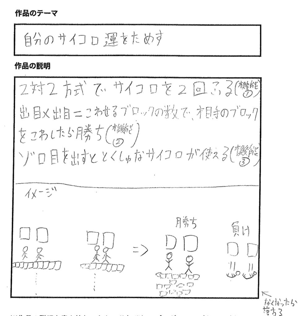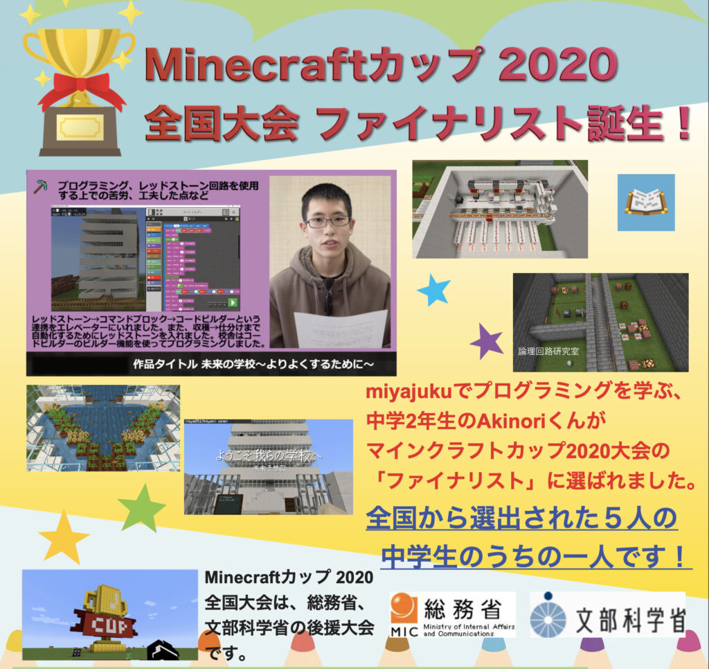 数ヶ月から半年程度学んだ生徒でも、そこまでで学んだ知識を駆使して作った作品を、全国小中学生プログラミング大会などに応募しています。
