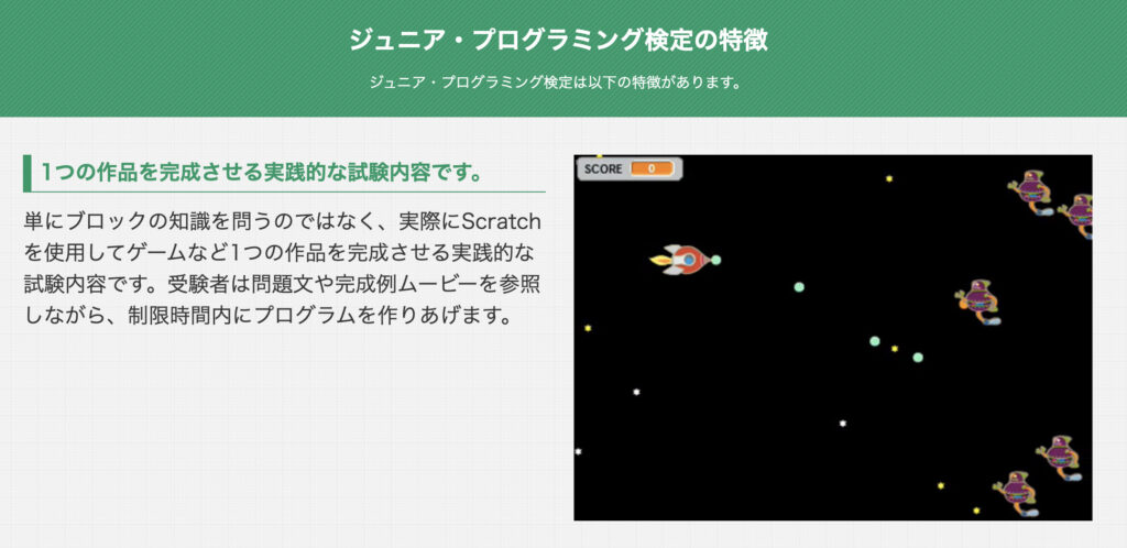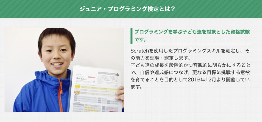 当教室は、資格検定のサーティファイが実施する、「ジュニア・プログラミング検定」の受験会場になっています。検定のレベルはGold(1級)、Silver(2級)、Bronze(3級)、Entry(4級)の4級種があり、学習の進度に合わせて受験できるようになっています。この検定の合格を一つの目標にすることで、学習のモチベーションのアップに繋がります。